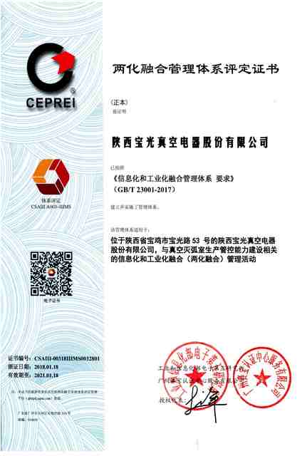 1月25日,寶光股份收到了由工信部電子第五研究所頒發(fā)的《兩化融合管理體系評(píng)定證書》,標(biāo)志著寶光股份兩化融合管理體系正式通過了國家認(rèn)證,寶光股份也成為國內(nèi)電真空行業(yè)首家取得國家兩化融合管理體系認(rèn)證的企業(yè)。