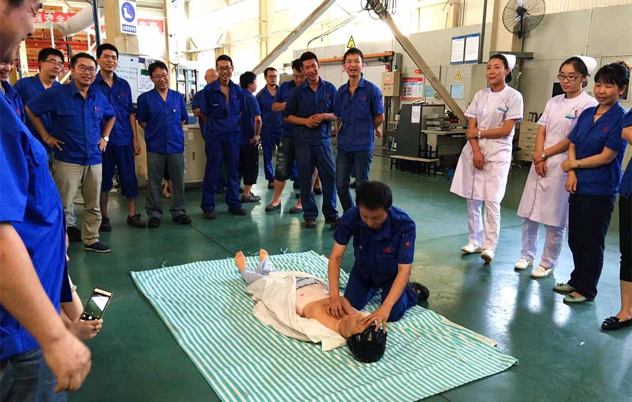 隨后,分別由2名護(hù)士在生產(chǎn)現(xiàn)場為職工進(jìn)行了徒手“心肺復(fù)蘇術(shù)”演練的規(guī)范操作,趙副院長講解了操作要點(diǎn)及注意事項(xiàng),現(xiàn)場職工積極參與,并親身體驗(yàn)了“現(xiàn)場救人”演練操作。